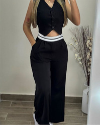 أطقم أنيقة من قطعتين للنساء صيف بلوزة بأزرار من الأعلى وجيب ديكور عالي الخصر طقم بنطال بساق مستقيمة واسعة ملابس الشارع