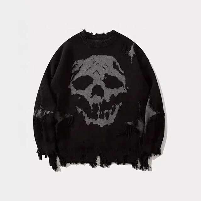 Suéteres de calaveras Gothic Punk Black Ripped Sweater Knitted Pullover Jumper Harajuku Oversized Y2K Streetwear Sweater Unisex